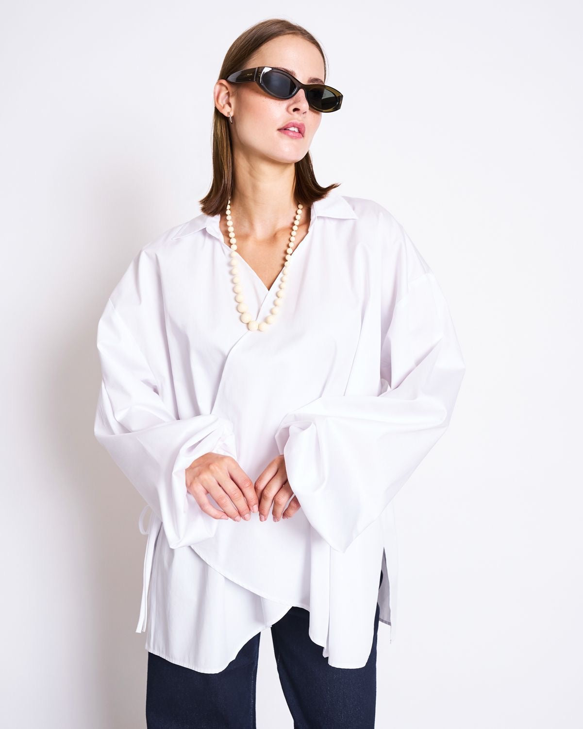 Weiße Wickelbluse im Oversized Look.