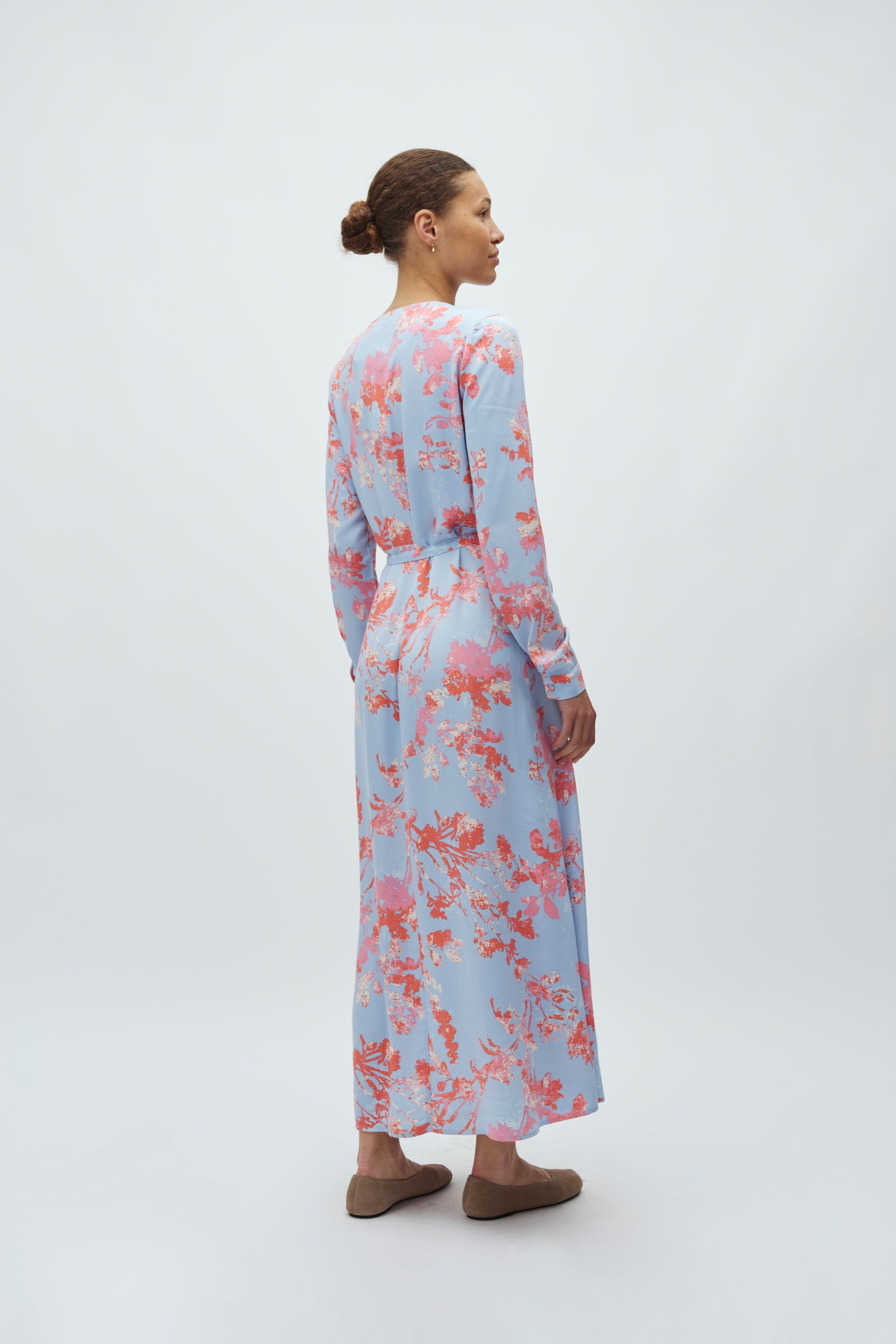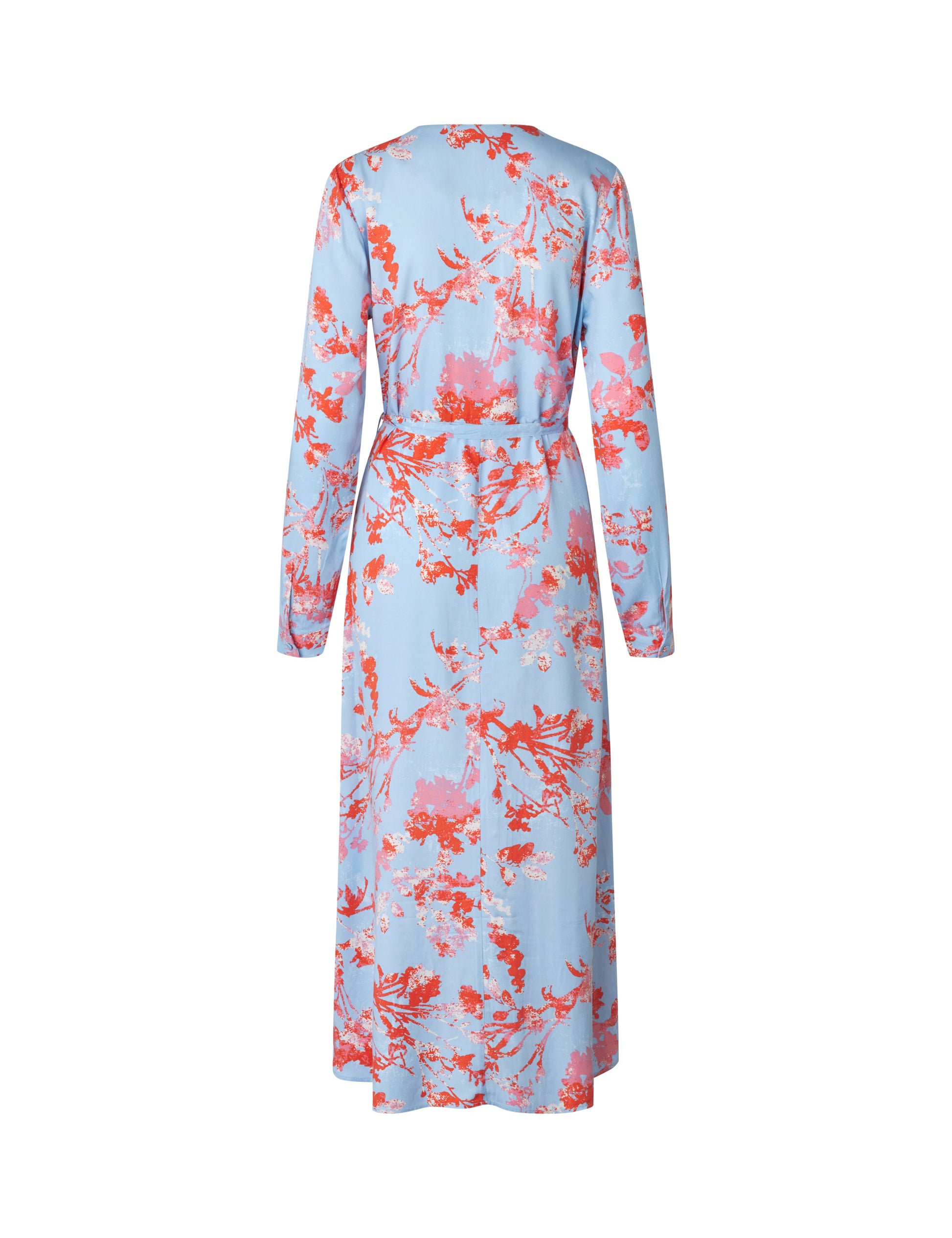 Kleid mit langen Ärmeln, V-Ausschnitt und floralem Muster.