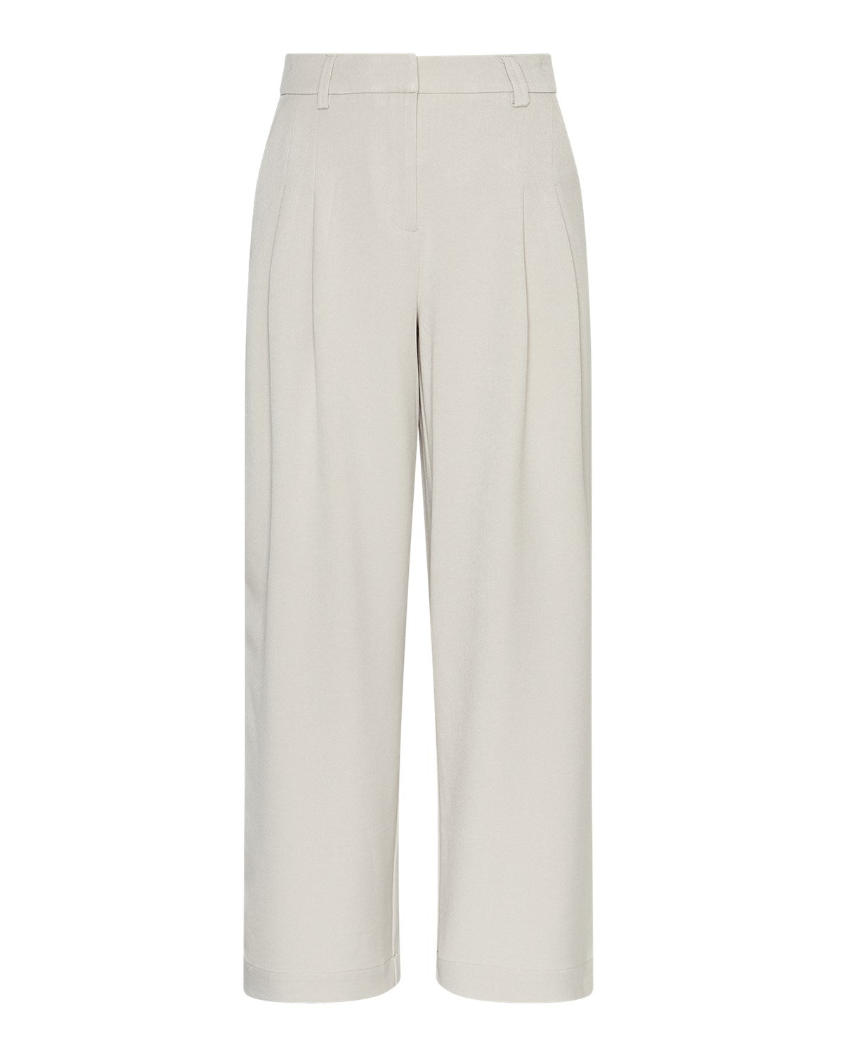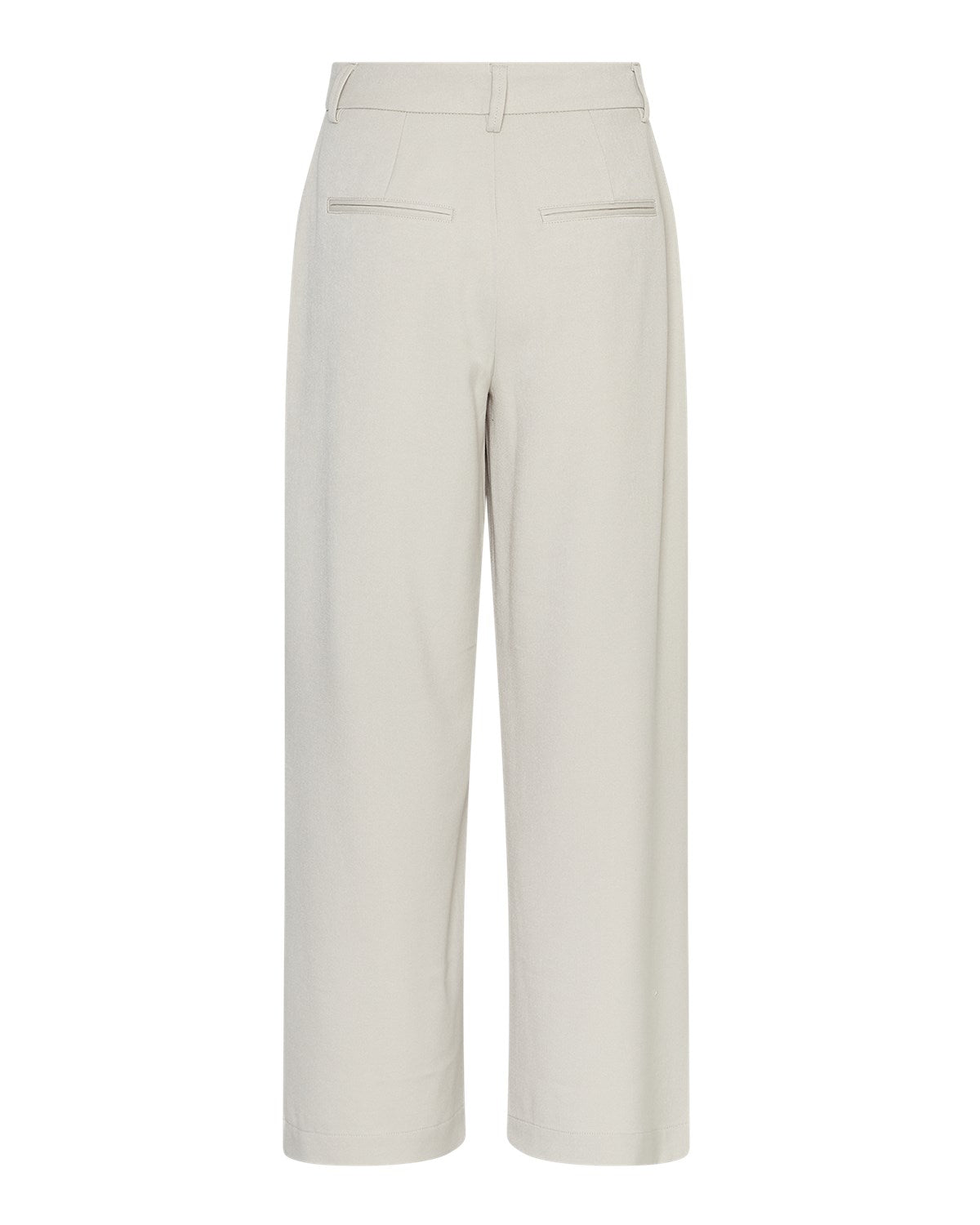 Stoffhose mit weitem Bein und Bügelfalten sowie aufgesetzten Taschen hinten.