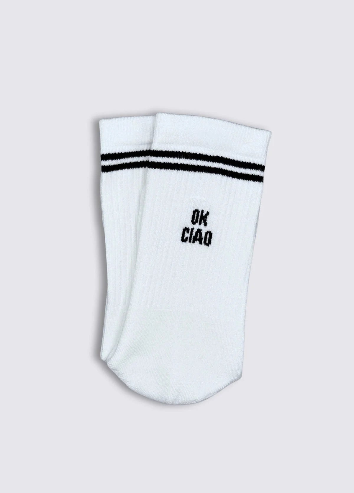 Ein charmanter Abschied – mit Haltung. OK CIAO kombiniert Leichtigkeit mit einer klaren Linie. Schwarze Message auf weißem Socken, mit Retro-Streifen.