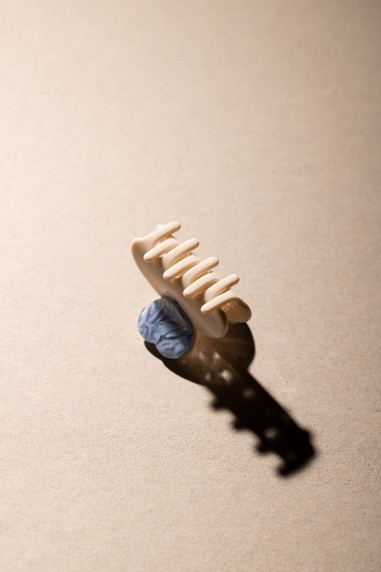In einer zarten Symphonie aus Beige und Babyblau verleiht diese Haarklammer deinem Haar eine besonders moderne Eleganz.