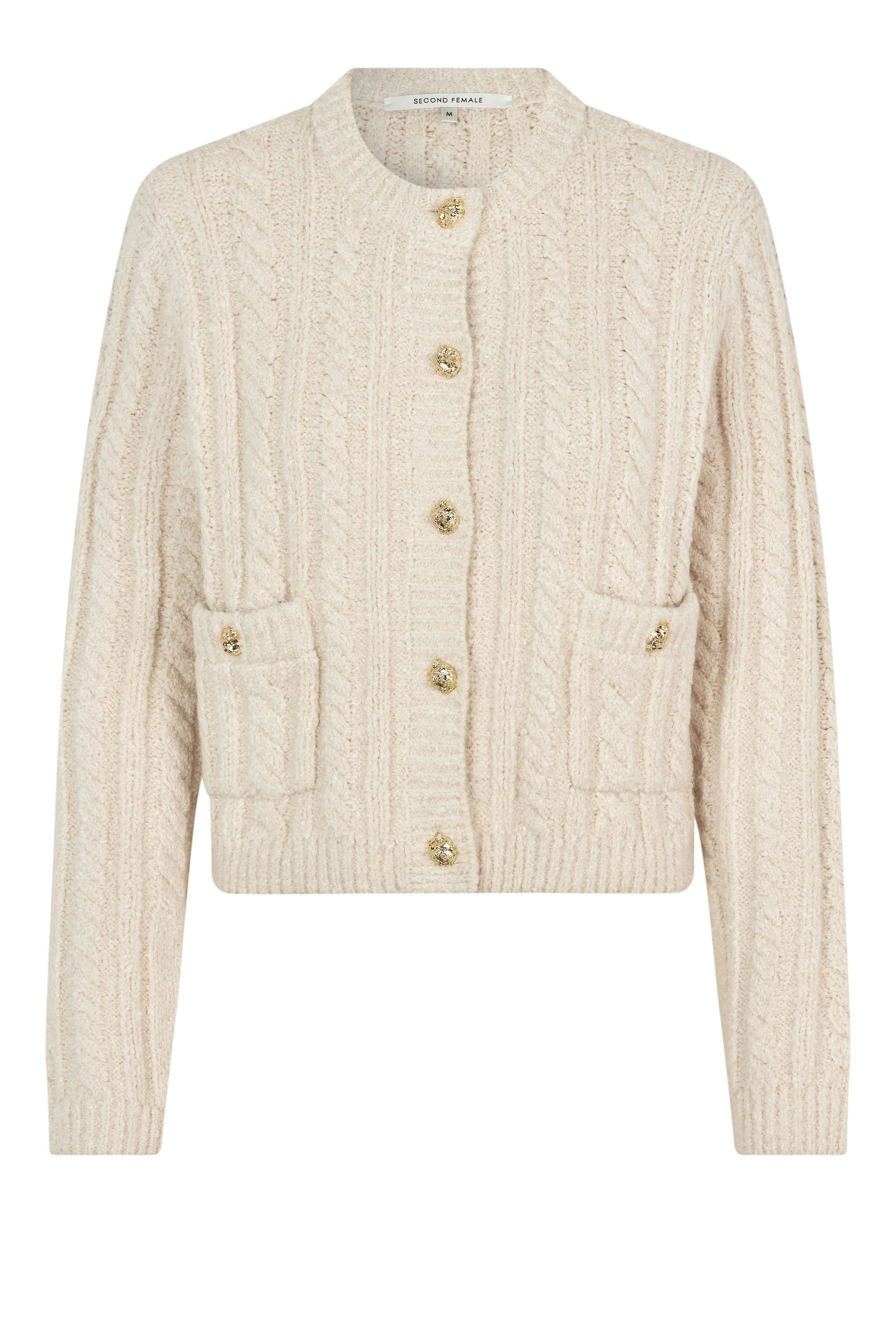 Strickcardigan mit Zopfmuster, Knopfleiste und aufgesetzten Taschen.