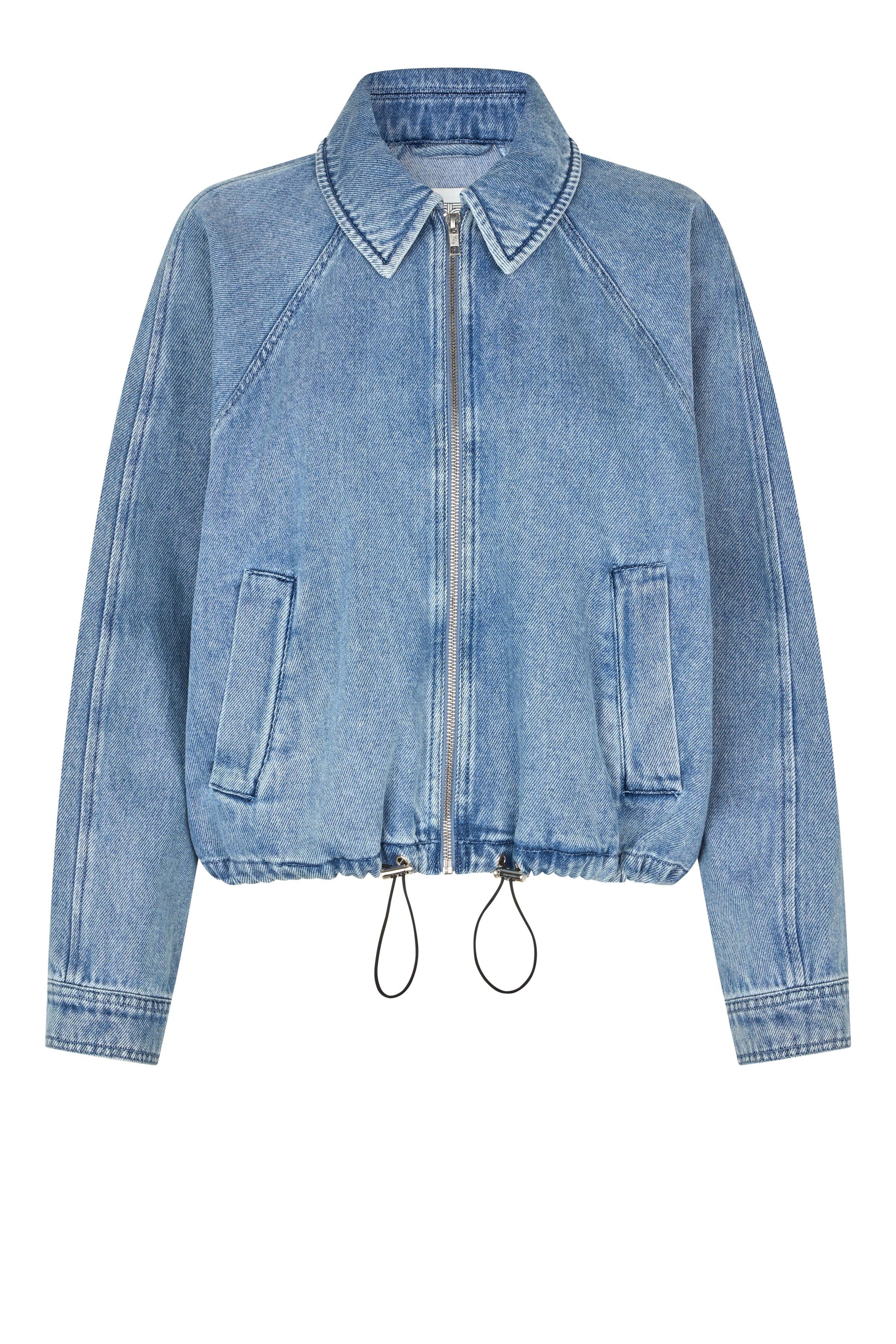 Jeansjacke im Bomberlook mit Bändern am Bund zum Verstellen der Weite.